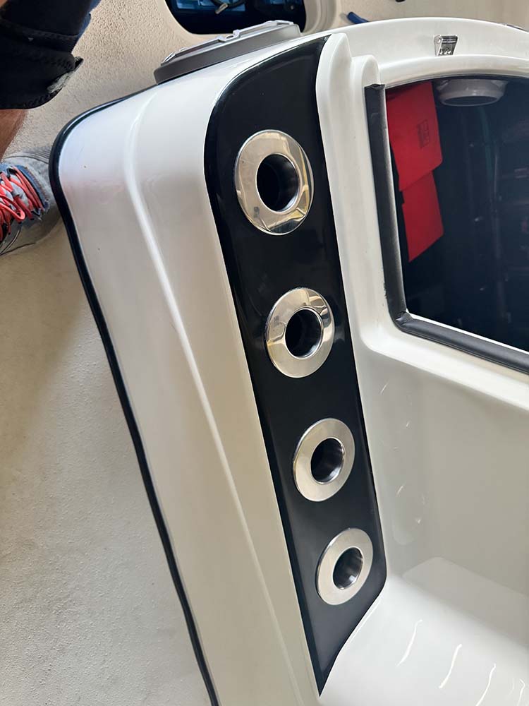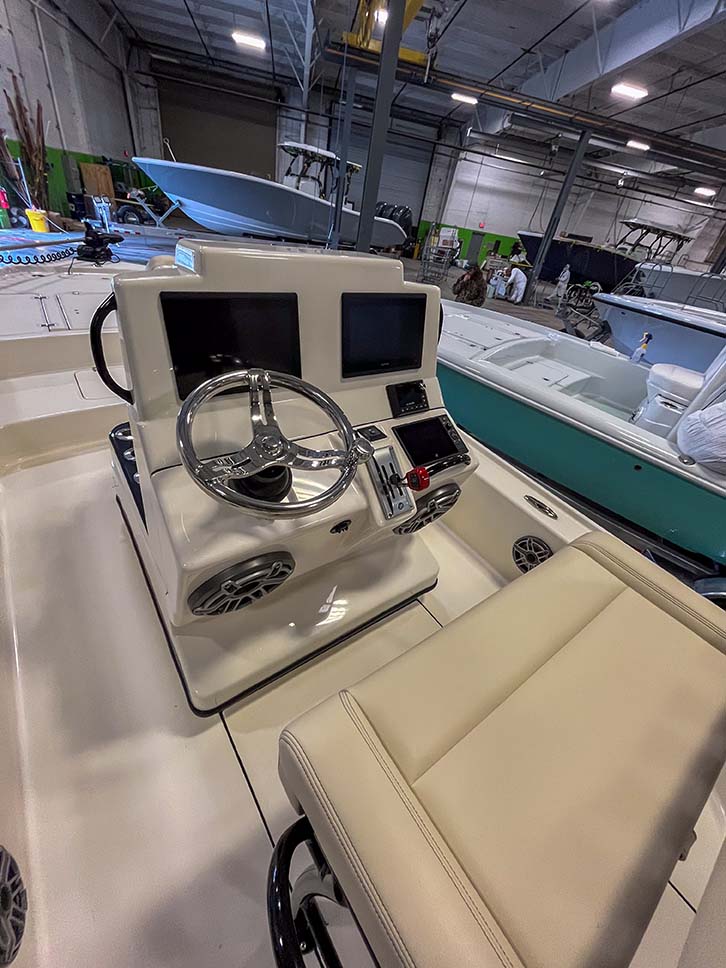 The stereo is more than enough with JL Marine two subs and six speakers Bluetooth and display on the dash as well as being linked into the Garmin MFD’s