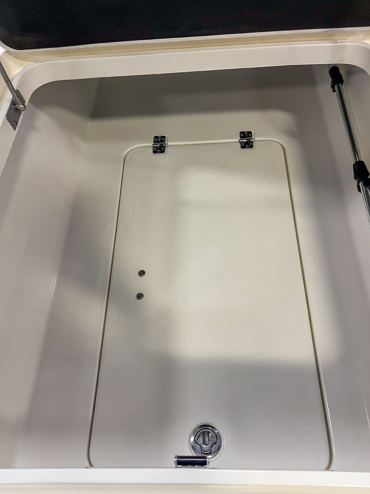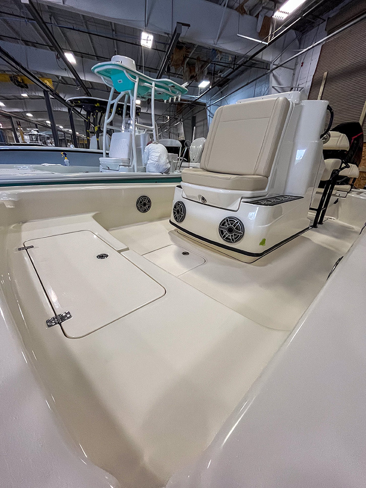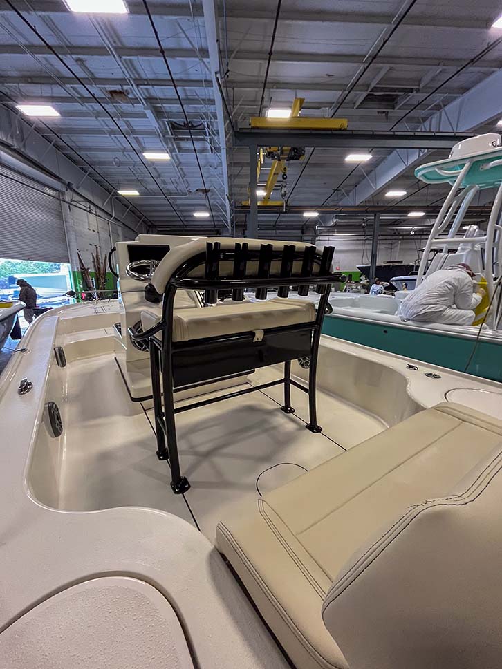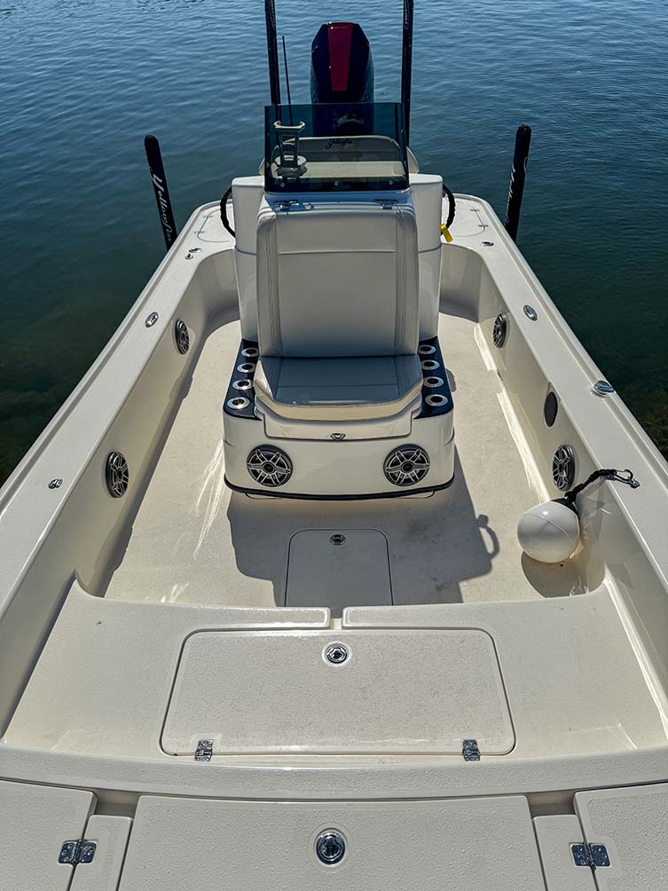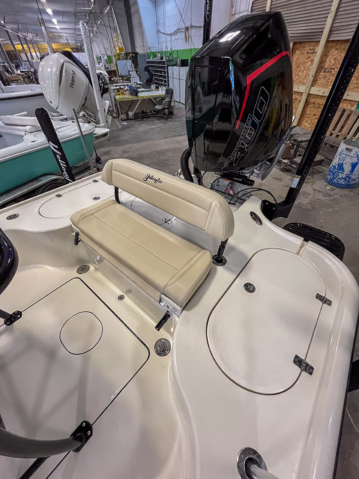 The upholstery was done by Yellowfin and is the basic upholstery for 24 foot Bay boat. The leaning post has six rod holders and a 10 inch tacklebox under the seat. The aft bench seat lifts up with super easy access to all the pumps and the bilge.