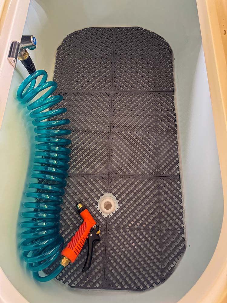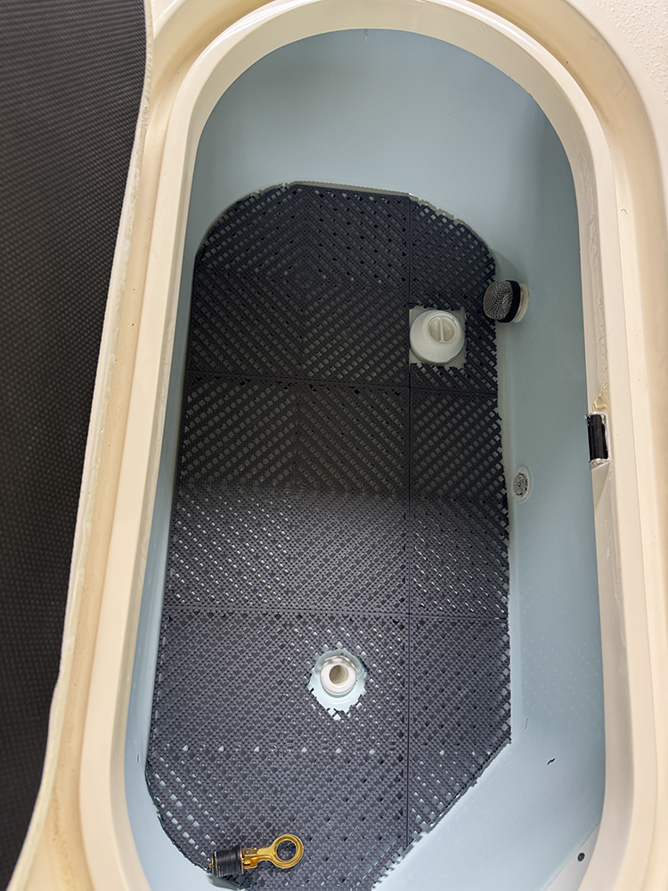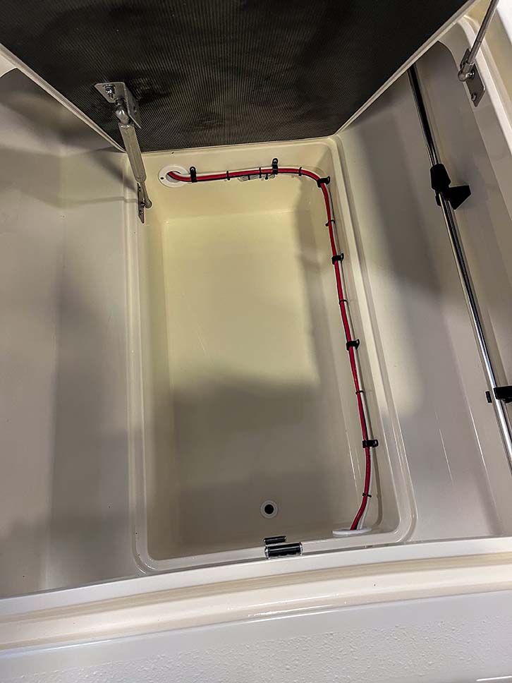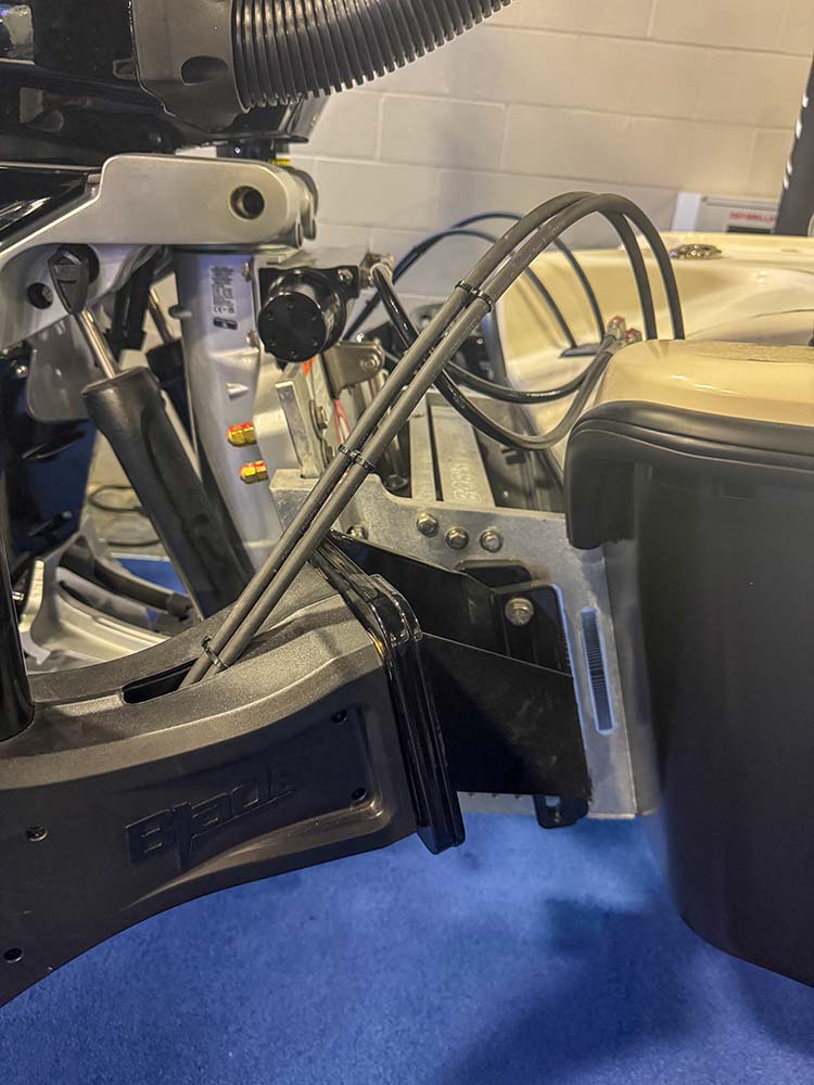 This boat is equipped with 10 foot power poles, shallow water anchors mounted on brackets attached to the Bob’s machine shop Jack plate. This is a One Pump system that was new in 2025. The system works very well and leave some more room inside the console where the pumps are mounted not needing two pumps. Everything is run off of remote control for the power poles and the trolling motor together on one remote.